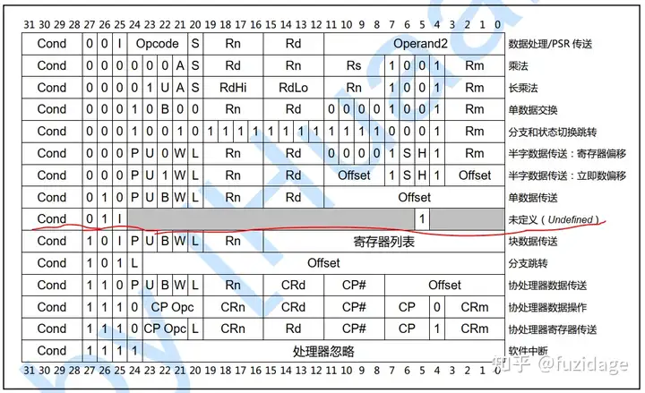 从上面的arm指令格式中可知,只要指令码属于划线的格式,就属于未定义指令异常。