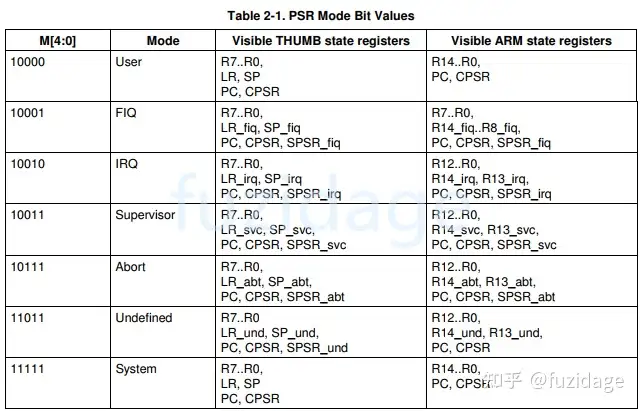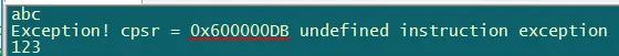 打印出print1中的字符串‘abc’后,紧接着打印printException函数中的结果,cpsr=0x600000db,那么对应的M[4:0]=11011, 对应下图为und模式。然后从und异常返回,恢复原来的模式继续执行。