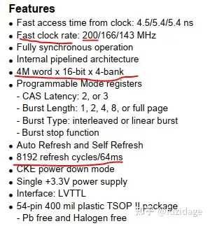 我们知道地址范围肯定是base_addr + size。我们根据片选接了nGCS6,base_addr=0x3000,0000,那么size是多大呢? 下图是我截取的sdram手册上的特性描述: