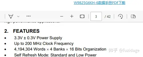 再以W9825G6KH这款SDRAM为例,地址总线A0-A12,数据总线D0-D15,因此内存大小:2^13 * 2^9 = = 4194304,等于4M,加上有4个bank,数据为宽16位,因此内存大小4Mx4x2字节