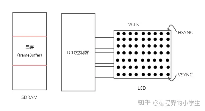 SDRAM:在SDRAM中申请了一块连续的内存作为LCD显示数据的存储,叫做显存(framebuffer)。