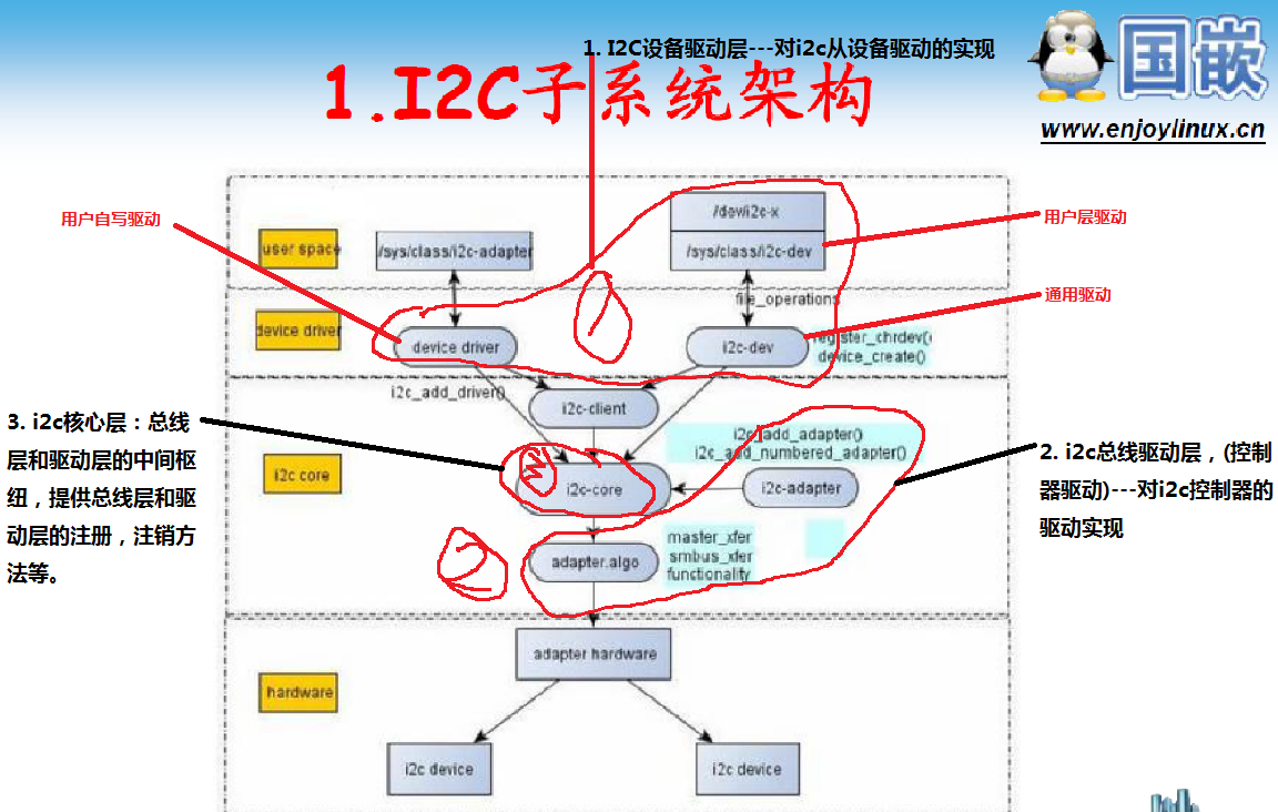 I2C总线驱动是I2C适配器的软件实现,提供I2C适配器与从设备间完成数据通信的能力,比如起始,停止,应答信号和master_xfer的实现函数。