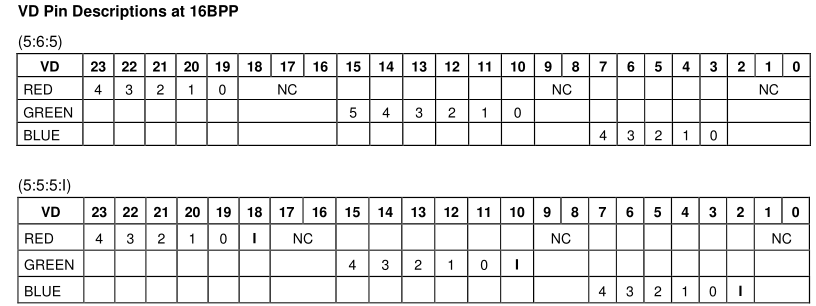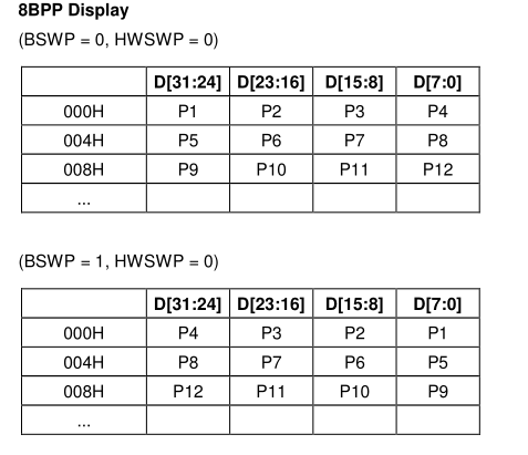 当设置为8bit时,LCD控制器会从framebuffer中得到8位的数据,这8位的数据不是直接发给lcd的,它是使用这8位的数据在这个调色板中作为索引,取出16位数据,再把这16位数据发给lcd。