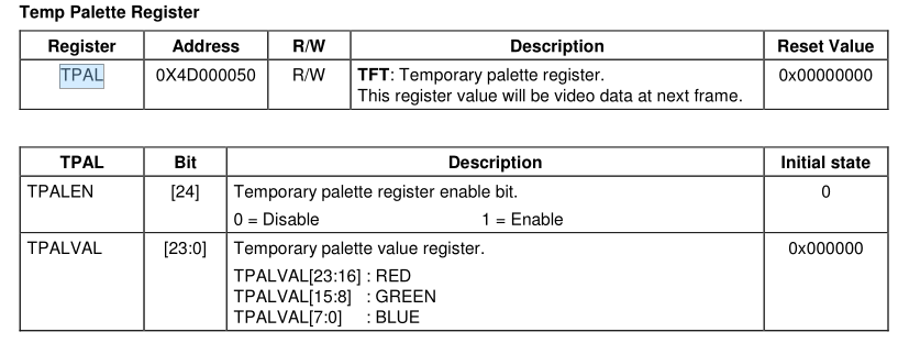 只要使能了TPALEN,对于lcd控制器来说,无论framebuffer中的数据是8bpp,16bpp还是24bpp,它都不管。它都会从临时调色板中取出数据,发送给lcd。因此,只要设置一个寄存器,就可以让整个lcd显示为同一种颜色,这是2440提供的一种特性。
