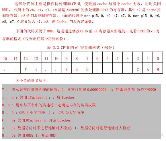 ldr r1, =0x7ff //屏蔽所有的中断源,S3C2440中寄存器只有前15位有效,故0x7ff置位INTSUNMSK ldr r0, =INTSUBMSK str r1, [r0] #endif //设置时钟频率 #if defined(CONFIG_S3C2440) mov r1, #5 str r1, [r0] mrc p15, 0, r1, c1, c0, 0 orr r1, r1, #0xc0000000 mcr p15, 0, r1, c1, c0, 0 mov r1, #CLK_CTL_BASE //S3C2440系统主频为405MHZ,USB为48MHZ,要求MPLLCON = (0x7f<<12) | (0x02<<4) | (0x01) = 0x7f021 mov r2, #MDIV_405 add r2, r2, #PSDIV_405 str r2, [r1, #0x04] #else /* FCLK:HCLK:PCLK = 1:2:4 */ /* default FCLK is 120 MHz ! */ ldr r0, =CLKDIVN mov r1, #3 str r1, [r0] mrc p15, 0, r1, c1, c0, 0 orr r1, r1, #0xc0000000 mcr p15, 0, r1, c1, c0, 0 mov r1, #CLK_CTL_BASE mov r2, #MDIV_200 add r2, r2,#PSDIV_200 str r2, [r1,#0x04] #endif #endif /* (CONFIG_S3C2400) || (CONFIG_S3C2410) || (CONFIG_S3C2440) */ 3,关闭MMU和CACHE,并调用lowlevel_init.S完成SDRAM和NANDFLASH的初始化,为代码的重定向做准备 /******************************************* * we do sys-critical inits only at reboot, * not when booting from ram! ******************************************/ #ifndef CONFIG_SKIP_LOWLEVEL_INIT bl cpu_init_crit //关闭MMU和CACHE,并调用lowlevel_init.S完成SDRAM和NANDFLASH的初始化 #endif ........... ........... ........... /* ************************************************************************* * * CPU_init_critical registers * * setup important registers * setup memory timing * ************************************************************************* */ #ifndef CONFIG_SKIP_LOWLEVEL_INIT cpu_init_crit: /* * flush v4 I/D caches */ mov r0, #0 //具体设置看下图,详细参考CP15指令:http://blog.csdn.net/gooogleman/article/details/3635238 mcr p15, 0, r0, c7, c7, 0 //向c7写入0将使ICache与DCache 无效flush v3/v4 cache mcr p15, 0, r0, c8, c7, 0 //向c8写入0将使TLB失效 flush v4 TLB /* * disable MMU stuff and caches //协处理器CP15的C1处理器可以设置MMU和caches,具体参考下图 */ mrc p15, 0, r0, c1, c0, 0 bic r0, r0, #0x00002300 @ clear bits 13, 9:8 (--V- --RS) bic r0, r0, #0x00000087 @ clear bits 7, 2:0 (B--- -CAM) orr r0, r0, #0x00000002 @ set bit 2 (A) Align orr r0, r0, #0x00001000 @ set bit 12 (I) I-Cache mcr p15, 0, r0, c1, c0, 0 /* * before relocating, we have to setup RAM timing * because memory timing is board-dependend, you will * find a lowlevel_init.S in your board directory. */ mov ip, lr //由于有两层调用,需要把lr保存到ip,以防止破坏 bl lowlevel_init //调用c函数,初始化FLASH和SDRAM,为代码重定向做准备 mov lr, ip mov pc, lr //返回 #endif /* CONFIG_SKIP_LOWLEVEL_INIT */ 代码重定向基本思路: 1.内存运行与否,是则设置堆栈,跳入c函数阶段 2.若不在内存运行,判断是在norflash还在nandflash运行 //代码重定向部分 /***************CHECK_CODE_POSITION******************************/ adr r0, _start /* r0 <- current position of code */ //检查代码是否在已经SDRAM中运行,是则设置堆栈,并跳入c代码部分 ldr r1, _TEXT_BASE /* test if we run from flash or RAM */ //_start为u-boot的真正运行地址,_TEXT_BASE为FLASH加载到SDRAM的地址,在config.mk中定义为0x33f80000 cmp r0, r1 /* don't reloc during debug */ //若相等,说明已经在SDRAM中运行,设置堆栈,并且调转到第二阶段的C函数 beq stack_setup //若不相等,则要判断是从NORFLASF或NANDFLASH启动 /***************CHECK_CODE_POSITION******************************/ /***************CHECK_BOOT_FLASH********************************/ ldr r1, =((4<<28)|(3<<4)|(3<<2)) /*address in 4000003c*/ mov r0, #0 //NANDFLASH的启动原理,启动时4K SRAM,即Stepping Stone,会映射到nGCS0,0x0000 0000地址,同时它还是会被映射到0x4000 0000地址 str r0,[r1] //而NORFLASH支持片上运行,并会被一直挂载到nGCS0,0x0000 0000,具体可以参照NANDFLASH启动原理 mov r1, #0x3c /*address in 0x3c*/ //NANDFLASH启动时,因为地址为16倍数对齐,此时0x0000 003c 和 0x4000 003c都为唯一确定的0xdeadbeef,即'Magic Mumber' ldr r0, [r1] //当0x4000 003c清零,若0x0000 003c读出也是零,则u-boot代码从NANDFLASH启动,否则从NORFLASH cmp r0, #0 bne relocate /*recover 0x4000003c */ ldr r0, =(0xdeadbeef) //若在NANDFLASH启动,必须保证代码和前4K拷贝到SRAM一致,否则会进入死循环 ldr r1, =((4<<28)|(3<<4)|(3<<2))
