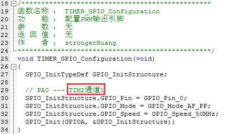 配置PA0为PWM输出引脚(这里的引脚需要和定时器的通道对应,否则没有波形输出),详情请看数据手册关于引脚的说明。