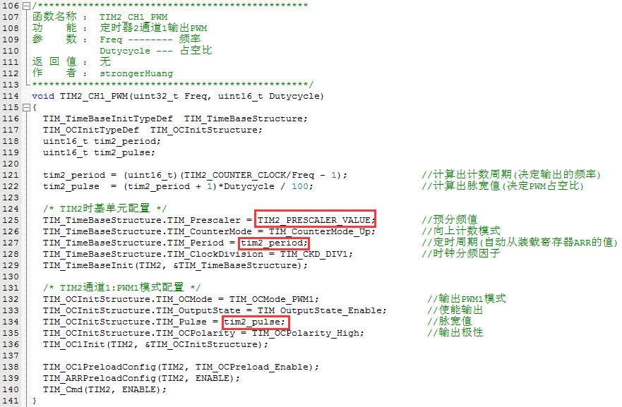 决定输出频率和占空比主要由这三个参数(TIM2_PRESCALER_VALUE、tim2_period、tim2_pulse)决定的。