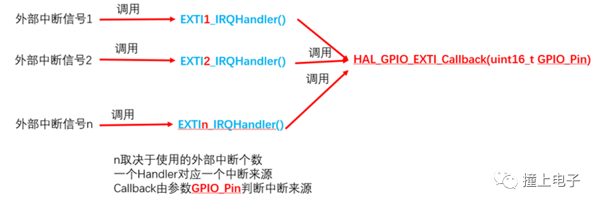 中断处理函数写在EXTI_IRQHandler()或HAL_GPIO_EXTI_Callback()皆可,不过HAL_GPIO_EXTI_Callback()需要重新声明,比如: