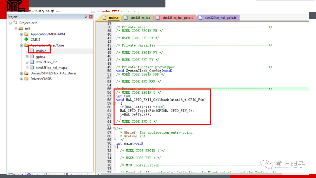 Hal_GPIO_TogglePin()这个函数可以反转引脚电平,以控制小灯亮灭,多加的那几行代码用来做一个简单的消抖,然后编译,下载。如果没出问题的话,每按一次按键,灯都会改变一次亮灭状态,上面用的是xxxit.c中的Handler函数,下面试一试Callback函数,注释掉刚才加的代码,在main.c中添加如下代码: