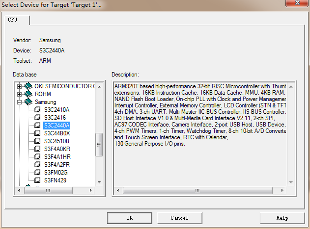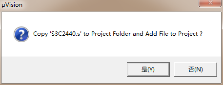 3)接下来选择CUP database:我们选择samsung的S3C2440A,点击OK;之后会出现第二个图问你是否拷贝'S3C2440.s'到工程文件夹并加入到工程里,S3C2440.s是启动代码我们选择YES