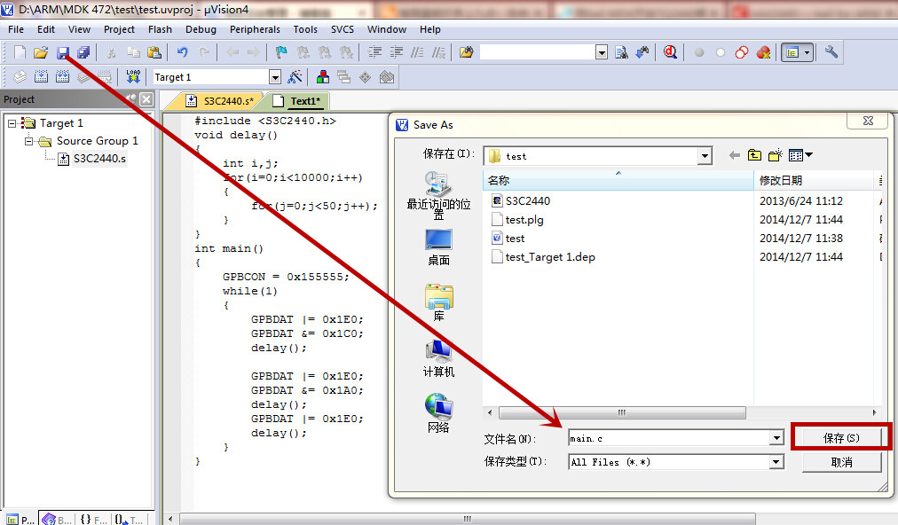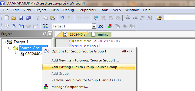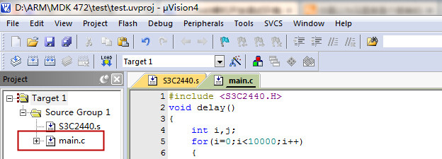 5)之后新建一个c文件并编写代码,我习惯新建一个main目录用来保存这个存放入口函数的文件,然后把这个文件加到工程里: