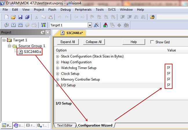 4)然后我们需要对S3C2440.s进行一些必须的配置,打开此文件选择编辑界面下面的Configuration wizard进行配置,这里我把全部都打上勾,然后保存: