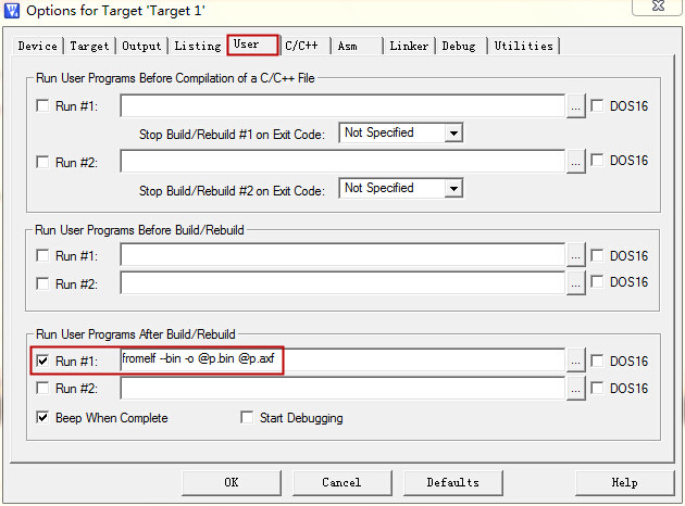 ④在User选项里相应位置添加命令如下:(用于生成.bin文件和.axf调试文件,添加的命令为:fromelf --bin -o @p.bin @p.axf,记得前面打勾)