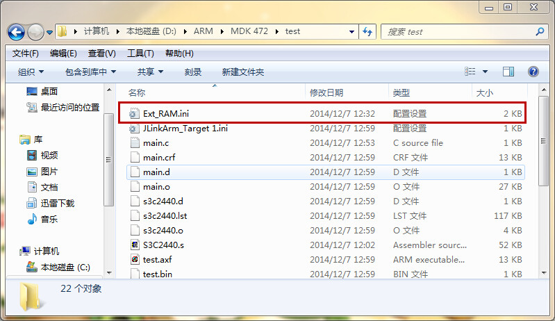 在工程目录下建立一个文本文档,复制下面代码,名字改成Ext_RAM.ini 将文中test改成自己的工程名称。
