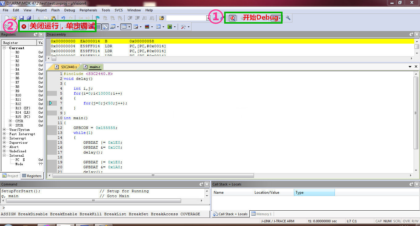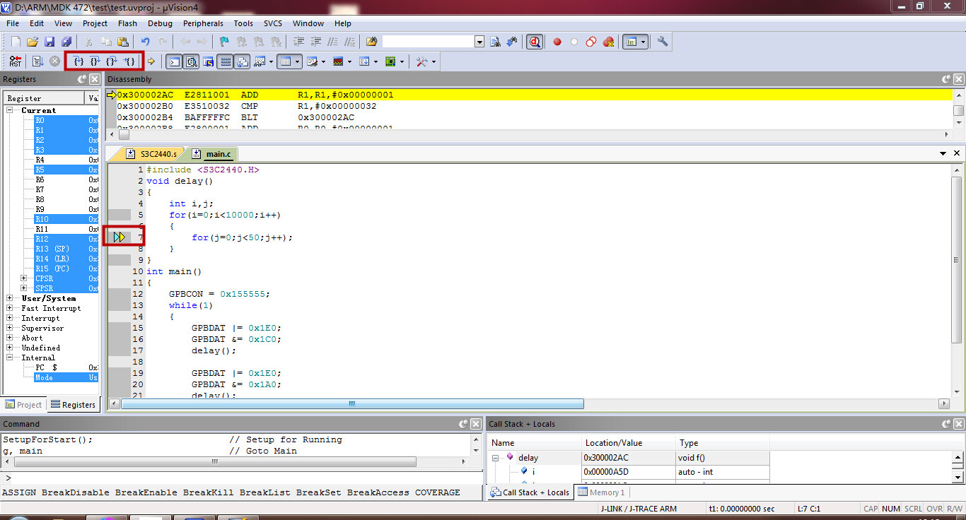 之后就算配置好了,现在rebuild一下,就可以在工程目录里生成bin文件跟axf文件了,连好Jlink和开发板,点击debug按照开始调试,不出以外,就可以开始调试了,如下所示: