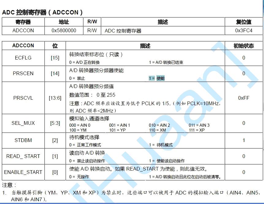 在常见的设计中,如mini2440开发板,一般AIN4、AIN5、AIN6、AIN7被用作了四线电阻触摸的YM、YP、XM、XP通道;剩余的AIN0~3被引出,其中AIN0直接和一个可调电阻W1连接。