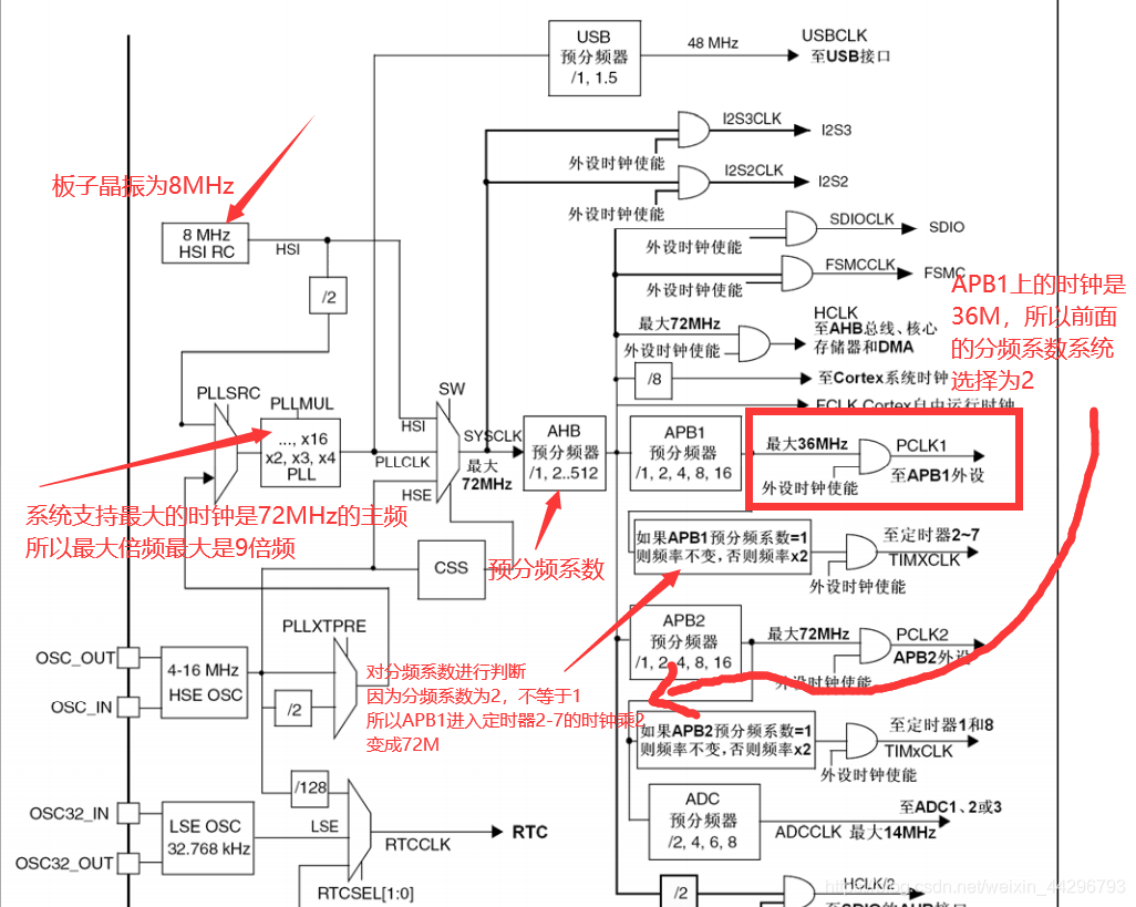 在系统时钟72M进入APB1之后进行了2分频,得到了36M,所以挂在APB1总线上的外设时钟频率是36M,因为分频系数不等于1,所以APB1的36需要进行乘2才进入定时器的时钟。