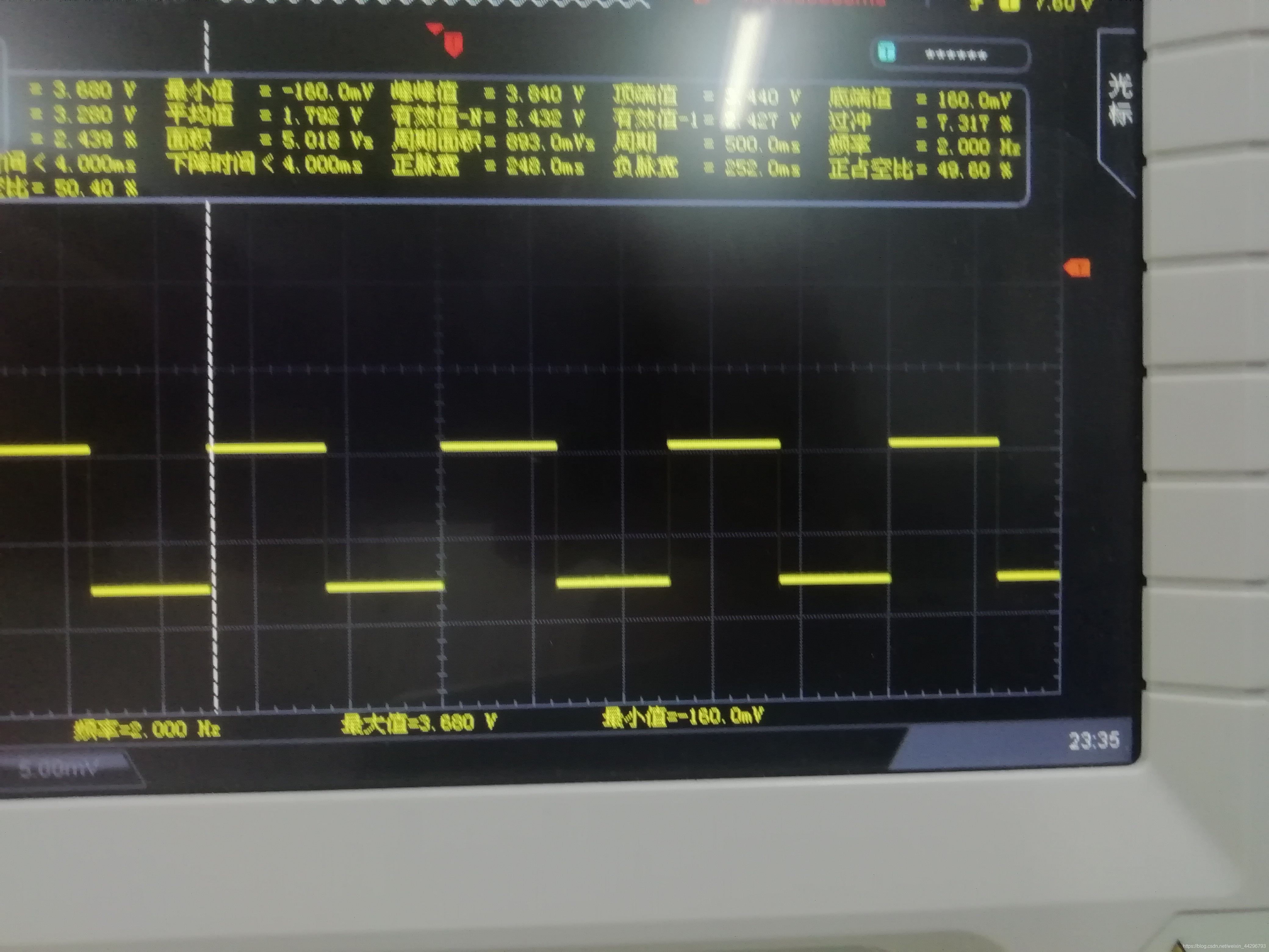我现在计数个数是5000个(0~4999),那时间就是 5000*0.1ms = 500 ms ,我让PE5每中断一次就取反一次,所以PE5的高电平时间应该是500,方波周期就是1s,频率为1Hz,