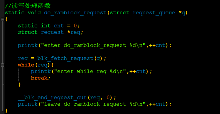 一些都准备就绪之后,当用户对虚拟块设备发出请求时,系统会调用读写函数do_ramblock_request来实现读写功能。但是刚开始,还是简单点,所以此处,我们的函数主要的功能就是打印信息,告诉我们是否进入了这个读写函数。