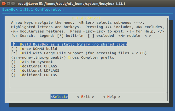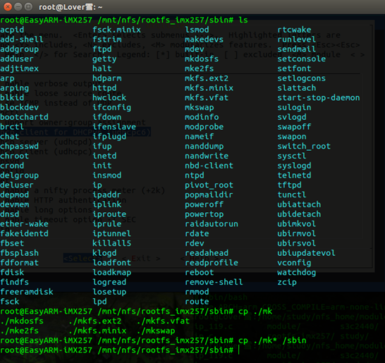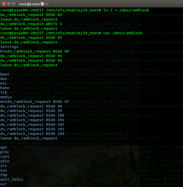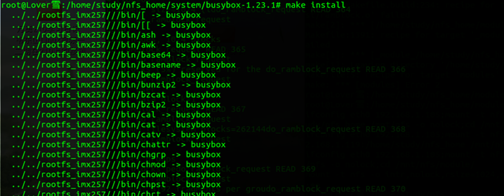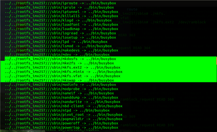 5 #include 6 #include 7 #include 8 #include 9 #include 10 #include 11 #include 12 #include 13 #include 14 #include 15 #include 16 #include 17 #include 18 #include 19 #include 20 #include 21 22 #include 23 #include 24 #include 25 26 static struct gendisk *ramblock_disk; //定义gendisk结构体 27 static struct request_queue *ramblock_queue; //定义请求队列结构体 28 static DEFINE_SPINLOCK(ramblock_lock); //定义一个自旋锁 29 static int major; //主设备号 30 #define RAMBLOCK_SIZE (1024*1024) //块设备的容量 31 32 33 //file_operation结构体 34 static struct block_device_operations ramblock_fops ={ 35 .owner = THIS_MODULE, 36 }; 37 38 //读写处理函数 39 static void do_ramblock_request(struct request_queue *q) 40 { 41 static int cnt = 0; 42 struct request *req; 43 44 printk('enter do_ramblock_request %dn',++cnt); 45 46 req = blk_fetch_request(q); 47 while(req){ 48 printk('enter while req %dn',++cnt); 49 break; 50 } 51 52 __blk_end_request_cur(req, 0); 53 printk('leave do_ramblock_request %dn',++cnt); 54 } 55 56 static int ramblock_init(void) 57 { 58 printk('ramblock_initn'); 59 /* 1.分配一个gendisk结构体 */ 60 ramblock_disk = alloc_disk(16); //次设备号个数:分区个数,若为1的话,则意思是只有一个分区 61 62 /* 2.设置 */ 63 /* 2.1 分配/设置队列:函数do_ramblock_request提供读写能力 */ 64 ramblock_queue = blk_init_queue(do_ramblock_request, &ramblock_lock); 65 66 /* 2.2 设置其他属性:比如容量 */ 67 major = register_blkdev(0,'ramblock'); //cat /proc/device 动态申请一个主设备号 68 69 ramblock_disk->major = major; //主设备号 70 ramblock_disk->first_minor = 0; //第一个次设备号 71 sprintf(ramblock_disk->disk_name, 'ramblock'); 72 ramblock_disk->fops = &ramblock_fops; //操作函数 73 ramblock_disk->queue = ramblock_queue; //队列 74 set_capacity(ramblock_disk,RAMBLOCK_SIZE/512); //设置容量,以扇区为单位 75 76 /* 3.注册 */ 77 add_disk(ramblock_disk); 78 79 return 0; 80 } 81 82 static void ramblock_exit(void) 83 { 84 printk('ramblock_exitn'); 85 unregister_blkdev(major, 'ramblock'); //卸载主设备号 86 del_gendisk(ramblock_disk); 87 put_disk(ramblock_disk); 88 blk_cleanup_queue(ramblock_queue); 89 } 90 91 module_init(ramblock_init); 92 module_exit(ramblock_exit); 93 MODULE_LICENSE('GPL'); 程序二:增加读写方向,实现挂载等功能 接着前面实现的驱动程序,我们来在它的基础是来实现读写功能以及挂载等功能, 1.分配、释放申请内存 很明显,实现读写的话,那必要要有内存来存储,所以我们必须要入口函数中增加申请内粗的函数。 既然在入口函数中申请了内存,自然就要在出口函数中实现释放内存的操作。 2.在读写函数中实现读写操作。 由于2.6内核的改动,读写函数中的一些对象的名称有点不太一样,不过总体的思路还是一模一样的。参考内核中其他代码的读写函数, 1):实现引入请求队列,并且遍历请求队列 2):当请求队列为真的时候,计算出请求队列的起始地址及长度 3):通过其实地址和长度判读请求是否有效是否超出内存 4):如果以上都通过之后,接下来就是关键了,判断读写方向,接着实现内存的memcpy 5):读写成功后,调用__blk_end_request_cur来返回读写成功与否 3.程序测试 加载驱动: 读写测试: 4.往开发板中增加mkfs命令 接下来就是使用使用mkfs来格式化,但是发现imx257开发板自带的2.6内核里面没有mkfs的命令. 解决办法:使用busybox来创建一个根文件,然后从那个根文件系统中把mkfs命令拷贝到开发板的sbin目录下,就可以了,步骤如下: 1.首先下载busybox-1.23.1.tar.bz2 2.编译busybox 2.1配置busybox 执行命令:make menuconfig ARCH=arm CROSS_COMPILE=arm-none-linux-gnueabi- Busybox Settings ---> //BusyBox的通用配置,一般采用默认值即可。 ---Applets Archival Utilities ---> //压缩、解压缩相关工具。 Coreutils ---> //最基本的命令,如cat、cp、ls等。 Console Utilities ---> //控制台相关命令。 Debian Utilities ---> //Debian操作系统相关命令。 Editors ---> //编辑工具,如vi、awk、sed等。 Finding Utilities ---> //查找工具,如find、grep、xargs。 Init Utilities ---> //BusyBox init相关命令。 Login/Password Management Utilities ---> //登陆、用户账号/密码等方面的命令。 Linux Ext2 FS Progs ---> //ext2文件系统的一些工具。 Linux Module Utilities ---> //加载/卸载模块等相关的命令。 Linux System Utilities ---> //一些系统命令。 Miscellaneous Utilities ---> //一些不好分类的命令,如crond、crontab。 Networking Utilities ---> //网络相关的命令和工具。 Print Utilities ---> //print spool服务及相关工具。 Mail Utilities ---> //mail相关命令。 Process Utilities ---> //进程相关命令,如ps、kill等。 Runit Utilities ---> //runit程序。 Shells ---> //shell程序。 System Logging Utilities ---> //系统日志相关工具,如syslogd、klogd。 2.2创建文件系统目录 2.2.1.创建文件系统的目录 1 #mkdir /home/study/nfs_home/rootfs_imx257/ 2 #cd /nfs_home/rootfs_imx25 3 #mkdir bin dev etc lib sbin proc sys var mnt tmp usr 4 #mkdir usr/bin usr/lib usr/sbin lib/modules 2.2.2.创建设备节点 #cd dev/ #mknod -m 666 console c 5 1 #mknod -m 666 null c 1 3 2.3配置选项 必须选中和修改的项: 1.'Build Busybox as a static binary(no share libs)' 2.'Don't use /usr' 3.'cross compiler prefix'--------->arm-none-linux-gnueabi- 4.'Busybox Installation prefix'--->/home/study/nfs_home/rootfs_imx257/ ****注意此处为你的文件系统目录的路径 (1选择的是静态连接库的方式,如果不选就是使用动态连接库的方式) (采用动态连接库的方式,在lib目录中添加应用程序所需的库文件) (Archival Utilities-->gzip这个选项一定不能掉) 找不到的话可以按下/进行搜索. 如图所示: 2.4错误解决 2.4.1错误一 root@Lover