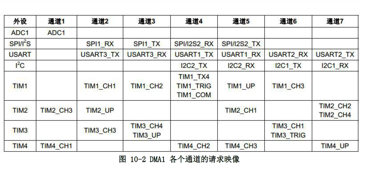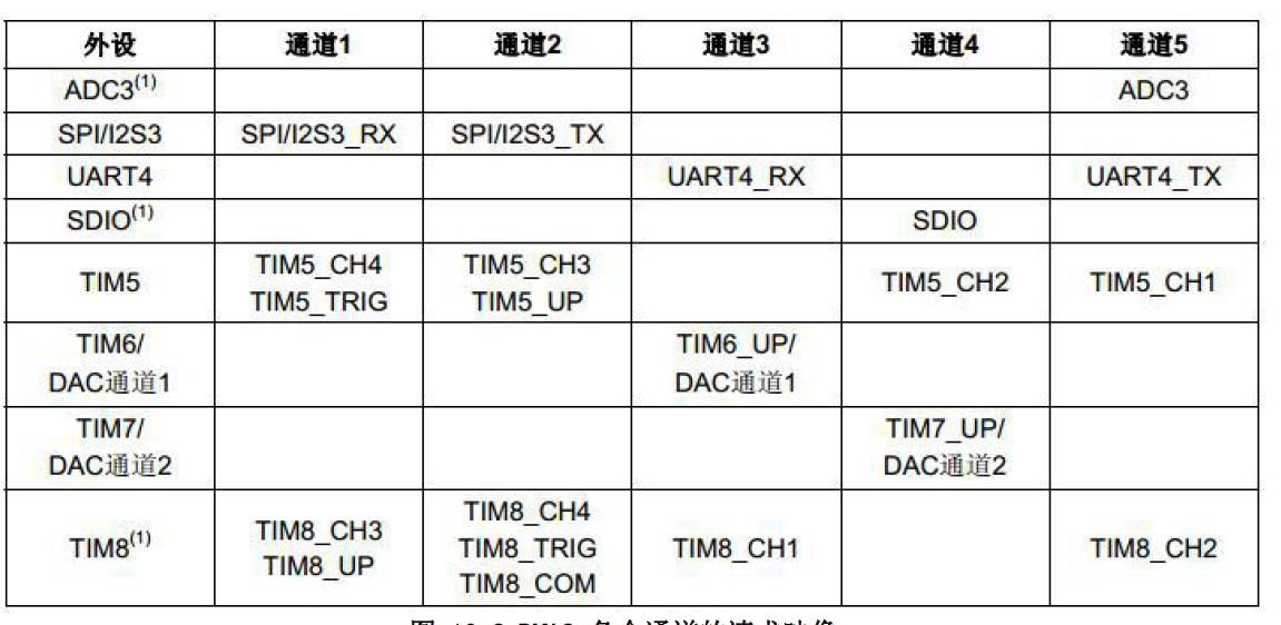 8、如果外设要想通过DMA 来传输数据,必须先给DMA 控制器发送DMA 请求,DMA 收到请求信号之后,控制器会给外设一个应答信号,当外设应答后且DMA 控制器收到应答信号之后,就会启动DMA 的传输,直到传输完毕。DMA 有DMA1 和DMA2 两个控制器,DMA1 有7 个通道,DMA2有5 个通道,不同的DMA 控制器的通道对应着不同的外设请求,这决定了我们在软件编程上该怎么设置,具体见DMA 请求映像表。
