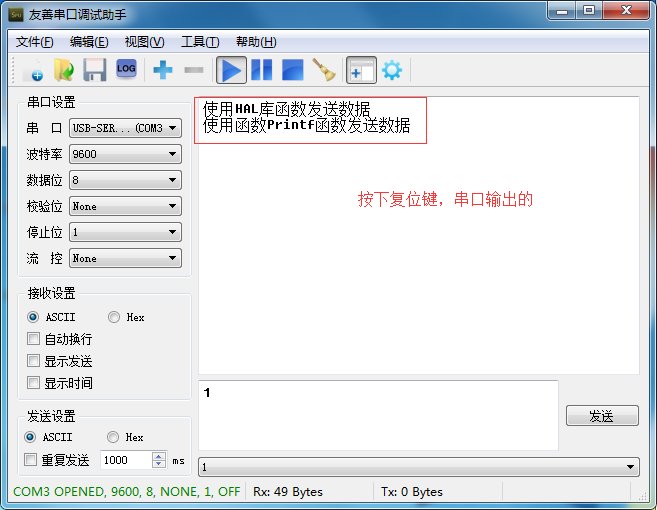 97 HAL_UART_Transmit (&huart1,'使用HAL库函数发送数据n',21,1000);