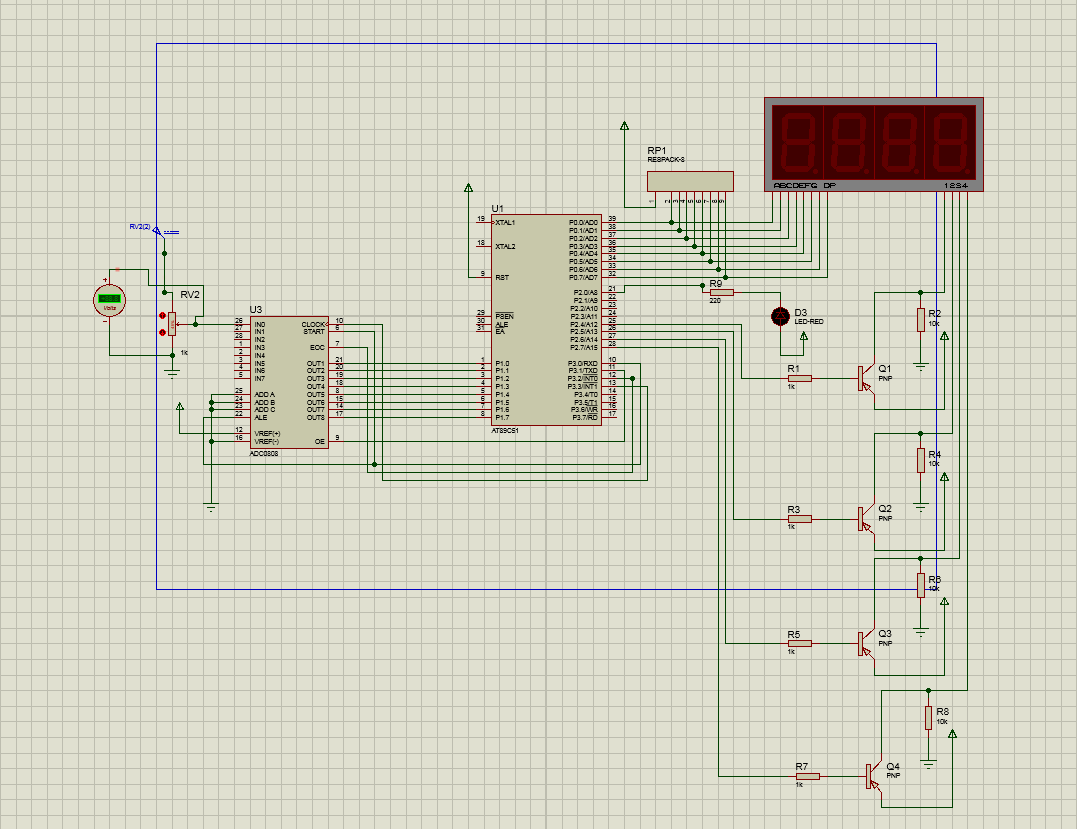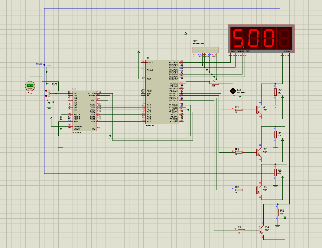 1 #include 2 #define uchar unsigned char //宏定义无符号字符型 3 #define uint unsigned int //宏定义无符号整型 4 code uchar seg7code[10]={ 0xc0,0xf9,0xa4,0xb0,0x99,0x92,0x82,0xf8,0x80,0x90}; //显示段码 数码管字跟 5 uchar wei[4]={0XEf,0XDf,0XBf,0X7f}; //位的控制端 //位控制码 6 sbit ST=P3^0; //A/D启动转换信号 7 sbit OE=P3^1; //数据输出允许信号 8 sbit EOC=P3^2; //A/D转换结束信号 9 sbit CLK=P3^3; //时钟脉冲 10 uint z,x,c,v,AD0809, date; //定义数据类型 11 /****************************************************************** 12 延时函数 13 ******************************************************************/ 14 void delay(uchar t) 15 { 16 uchar i,j; 17 for(i=0;i 19 for(j=13;j>0;j--); 20 { ; 21 } 22 } 23 } 24 /********************************************************************** 25 数码管动态扫描 26 *********************************************************************/ 27 void xianshi() //显示函数 28 { 29 uint z,x,c,v; 30 z=date/1000; //求千位 31 x=date%1000/100; //求百位 32 c=date%100/10; //求十位 33 v=date%10; //求个位 34 35 P2=0XFF; 36 P0=seg7code[z]&0x7f; 37 P2=wei[0]; 38 delay(80); 39 P2=0XFF; 40 P0=seg7code[x]; 41 P2=wei[1]; 42 delay(80); 43 P2=0XFF; 44 P0=seg7code[c]; 45 P2=wei[2]; 46 delay(80); 47 P2=0XFF; 48 P0=seg7code[v]; 49 P2=wei[3]; 50 delay(80); 51 P2=0XFF; 52 } 53 /************************************************************************* 54 CLK振荡信号 55 **************************************************************************/ 56 void timer0( ) interrupt 1 //定时器0工作方式1 57 { 58 59 TH0=(65536-2)/256; //重装计数初值 60 TL0=(65536-2)%256; //重装计数初值 61 CLK=!CLK; //取反 62 } 63 64 /************************************************************************* 65 主函数 66 **************************************************************************/ 67 void main() 68 { 69 TMOD=0X01; //定时器中断0 70 71 CLK=0; //脉冲信号初始值为0 72 TH0=(65536-2)/256; //定时时间高八位初值 73 TL0=(65536-2)%256; //定时时间低八位初值 74 EA=1; //开CPU中断 75 ET0=1; //开T/C0中断 76 TR0=1; 77 while(1) //无限循环 78 { 79 ST=0; //使采集信号为低 80 ST=1; //开始数据转换 81 ST=0; //停止数据转换 82 while(!EOC); //等待数据转换完毕 83 OE=1; //允许数据输出信号 84 AD0809=P1; //读取数据 85 OE=0; //关闭数据输出允许信号 86 if(AD0809>=251) //电压显示不能超过5V 87 AD0809=250; 88 date=AD0809*20; //数码管显示的数据值,其中20为采集数据的毫安值 89 xianshi(); //数码管显示函数 90 91 } 92 }