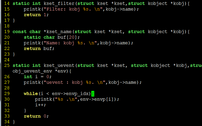struct kset_uevnt_ops{ int (*filter)(struct kset *kset,struct kobject *kobj); const char *(*name)(struct kset *kset, struct kobject *kobj ); int (*uevent)(struct kset *kset,struct kobject *kobj,struct kobj_uevent *env); } |