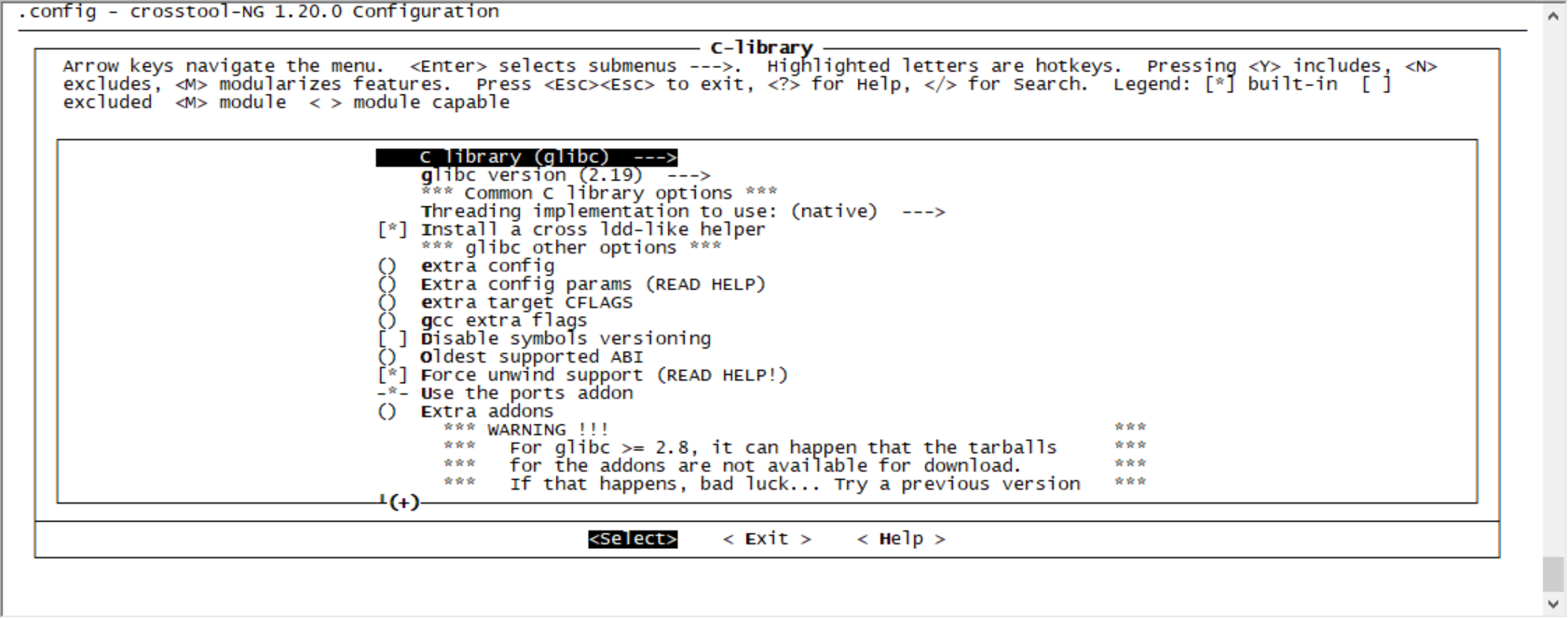 C-library --->菜单,选择glibc库版本,使用默认参数