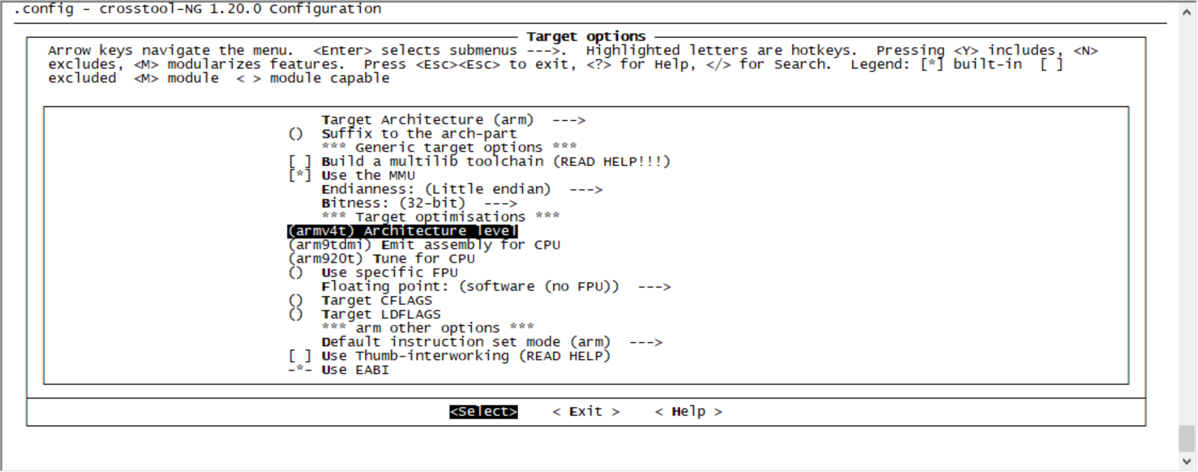 2)、ARMv4t 表示编译出的编译器支持ARMv4t架构的cpu;ARM920t 为指定cpu的类型,S3C2440使用的CPU核心为ARM920t。通过查找资料,这个应该是指令集的架构,对于S3C2410/S3C2440,都ARM920T的核心,架构指令是armv4t,所以,如果要编译2410/2440的,就选armv4t。以此类推S3C6410 ARM1176JZF-S核心使用的是armv6架构,就选armv6。可以通过./arm-linux-gcc --target查看架构。