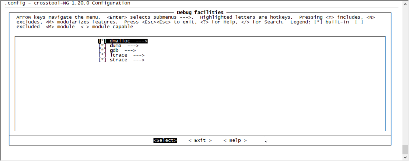 Debug facilities --->菜单,选择调试工具版本,默认参数。