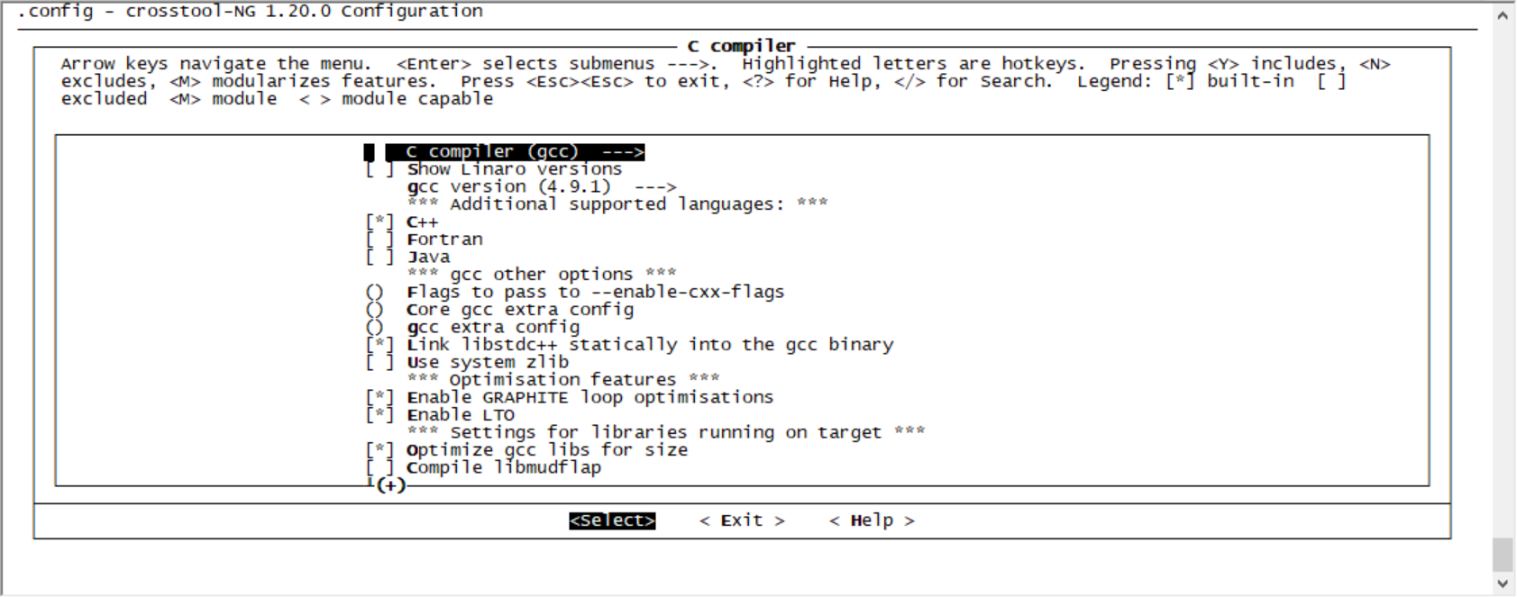 C compiler --->菜单选择GCC版本,选择默认参数