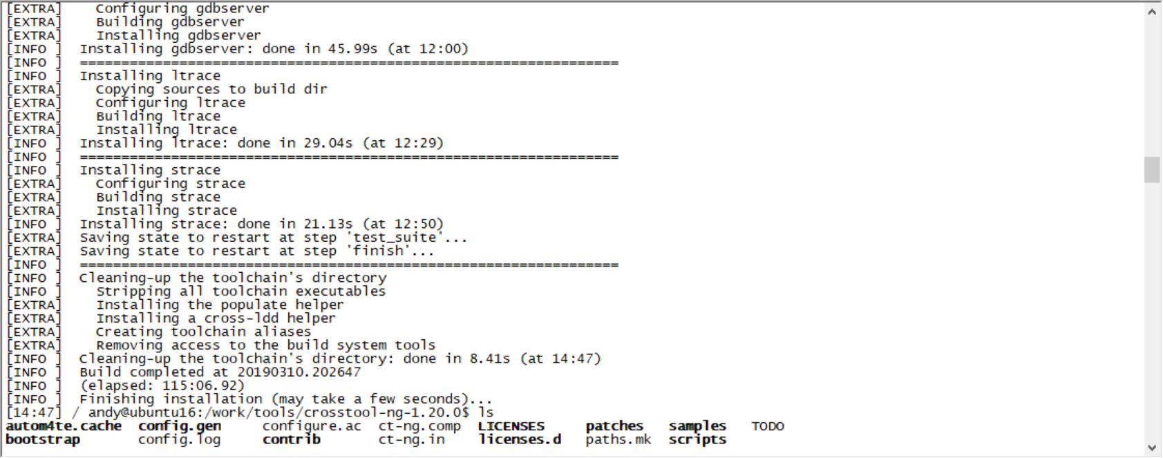 g、最后编译成功界面如下,切换到编译后的路径/work/tools/crosstool-ng_build/bin。执行./arm-linux-gcc -v。若有信息输出,说明编译成功