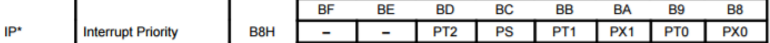 MOV IP, #014H ; PS:PT1:PX1:PT0:PX0 = 10100(INT1高级中断,串口高级中断)