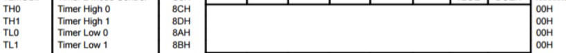 TH0/TL0,TH1/TL1这四个寄存器都是不能位寻址的,代表的是定时器/计数器0,定时器/计数器1的当前值,当我们开启定时器/计数器时前要设定他们的初值。