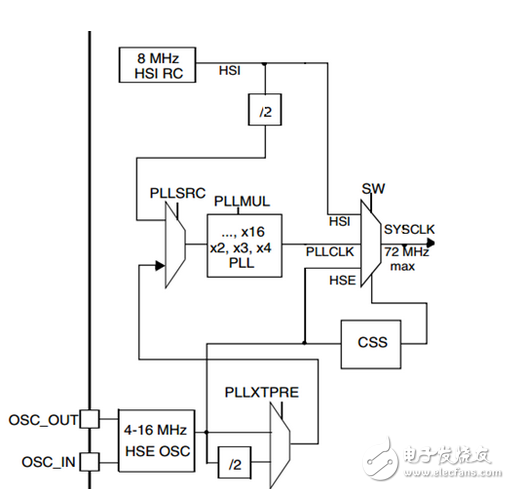 ⑤PLL为锁相环倍频输出,其时钟输入源可选择为HSI/2、HSE或者HSE/2。倍频可选择为2~16倍,但是其输出频率最大不得超过72MHz。