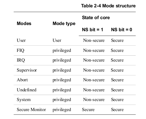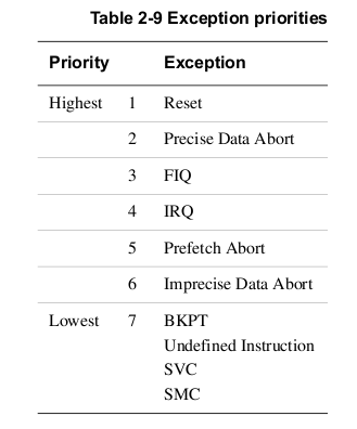 除了system mode和user mode,其余6中工作模式都属于exception,优先级如下: