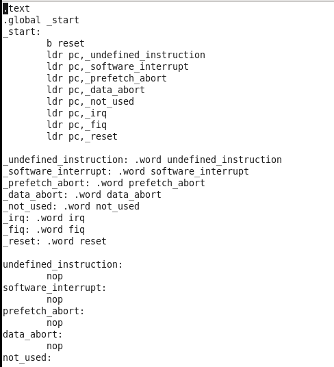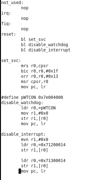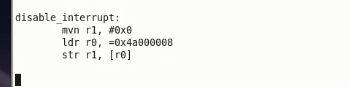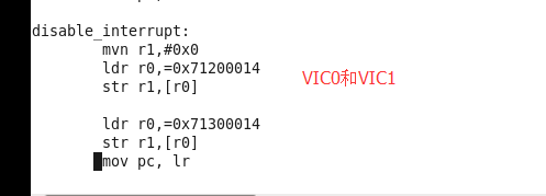 关闭中断 1.设置cpsr中的I位和F位为1,屏蔽中断和快速中断。在设置svc模式时已经设置了这两位 2.设置中断屏蔽寄存器,屏蔽中断 3.产生的中断会被保存在SRCPND中,通过MASK(屏蔽中断寄存器)决定是否被CPU感知。如果关闭MASK,则产生的中断不会被CPU感知,可以中datasheet中的INTERRUPT CONTROLLER找到相关描述 4.屏蔽中断寄存器INTMSK(0x4A000008),中有32位,每一位对应一个中断,设置相应位为1表示屏蔽该中断。在这里需要设置该中断为全1。 5.在6410和210中的屏蔽中断分别有两组和四组,每组分别由中断使能和中断屏蔽两个寄存器控制,所以屏蔽