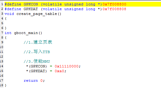 从上面可知对应GPIO的段物理基地址是0x7f000000.那么要在虚拟地址当中找一个段与之形成对应关系,那么这个段是多少呢,假如是0xa0000000这个段,把这两个段关联起来,那么通过页表来建立这个关系。那么这个页表存放在内存的起始地址0x50000000。接下来就要建立该页表的页表项,要建立页表项就要知道它在页表当中的位置,它的位置实际上就是页表的起始地址+虚拟地址的高12位,
