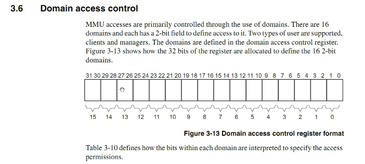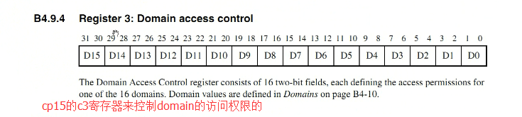 ARM系统把整个的存储空间分为了16个域,每一个域可以有一个权限,你可以选择你访问的区域放到哪一个域里面去,假如我们放到我们的域0里面,放到哪个域都没有关系,那么放到域0之后,那么这个区域的访问权限怎么来决定呢,