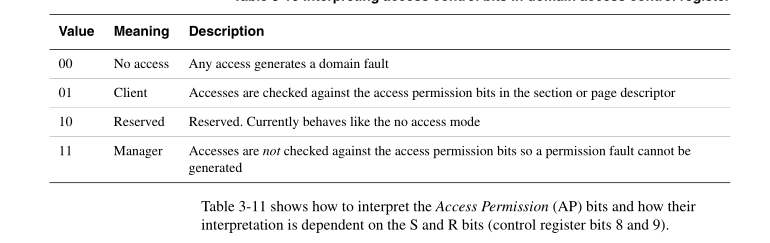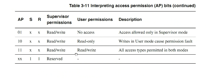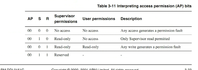 由三个因素AP、S、R来决定的;S、R由域里面的S、R来决定的,在cp15里面每一个域都有一个S和R设置,当把AP设置为11的时候,就不管S和R了,都可以进行读写操作。