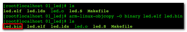 -- 转换命令 : 进入 led 目录, 继续上面的 led 编译, 链接 生成了 led.elf 文件, 执行 arm-linux-objcopy -O binary led.elf led.bin 命令, 将 elf 文件转换为 bin 文件;