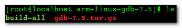[root@localhost arm-linux-gdb-7.5]# cat build-all #/bin/sh rm -fr gdb-7.5 rm -r /opt/arm-linux-gdb/ tar xvzf gdb-7.5.tar.gz cd gdb-7.5 ./configure --target=arm-linux --prefix=/opt/arm-linux-gdb/ -v make && make install cd /opt/arm-linux-gdb/