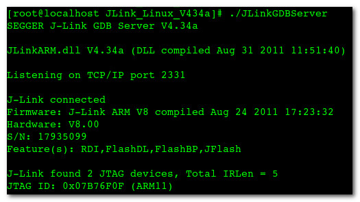 [root@localhost JLink_Linux_V434a]# ./JLinkGDBServer SEGGER J-Link GDB Server V4.34a JLinkARM.dll V4.34a (DLL compiled Aug 31 2011 11:51:40) Listening on TCP/IP port 2331 J-Link connected Firmware: J-Link ARM V8 compiled Aug 24 2011 17:23:32 Hardware: V8.00 S/N: 17935099 Feature(s): RDI,FlashDL,FlashBP,JFlash J-Link found 2 JTAG devices, Total IRLen = 5 JTAG ID: 0x07B76F0F (ARM11)