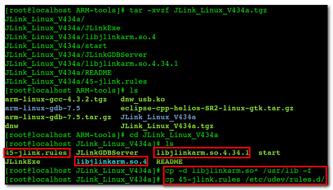 [root@localhost ARM-tools]# tar -xvzf JLink_Linux_V434a.tgz JLink_Linux_V434a/ JLink_Linux_V434a/JLinkExe JLink_Linux_V434a/libjlinkarm.so.4 JLink_Linux_V434a/start JLink_Linux_V434a/JLinkGDBServer JLink_Linux_V434a/libjlinkarm.so.4.34.1 JLink_Linux_V434a/README JLink_Linux_V434a/45-jlink.rules [root@localhost ARM-tools]# ls arm-linux-gcc-4.3.2.tgz dnw_usb.ko arm-linux-gdb-7.5 eclipse-cpp-helios-SR2-linux-gtk.tar.gz arm-linux-gdb-7.5.tar.gz JLink_Linux_V434a dnw JLink_Linux_V434a.tgz [root@localhost ARM-tools]# cd JLink_Linux_V434a [root@localhost JLink_Linux_V434a]# ls 45-jlink.rules JLinkGDBServer libjlinkarm.so.4.34.1 start JLinkExe libjlinkarm.so.4 README [root@localhost JLink_Linux_V434a]# cp -d libjlinkarm.so* /usr/lib -f [root@localhost JLink_Linux_V434a]# cp 45-jlink.rules /etc/udev/rules.d/