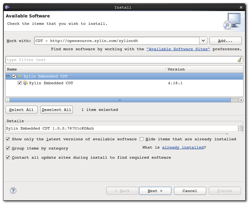 -- 安装 CDT 插件 : 地址 http://opensource.zylin.com/zylincdt , 注意 三个都选择;
