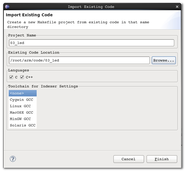 -- 导入工程 : 选择 菜单 'File' --> 'New' --> 'Makefile Project with Existing Code'