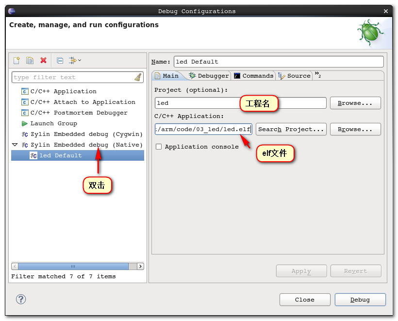 -- 设置Main 选项卡 : 双击 Zylin Embedded debug (Native), 创建 Degug, 设置工程名, 设置调试程序, 注意选择 elf 格式的文件;