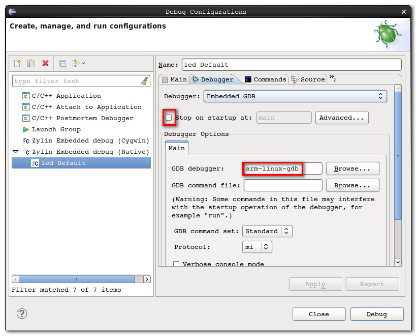 -- 设置 Debugger 选项卡 : 取消 Stop on startup at : main 选项, GDB debugger 程序选择为 arm-linux-gdb;