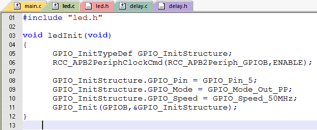 这里直接开始码代码了,至于前期的准备工作比如配置MDK-keil,或配置IAR等,大家可以在网上找对应的教程,这里不赘述了;直接讲代码如何撸吧,代码里我做了详细注释: 1)编译器IAR8,系统win10; 2)板子:STM32F103C8T6核心板,如下: 3)下载器:ST-LINK/V2仿真下载器; 4)板子上LED对应的引脚是GPIOC, GPIO_Pin_13;在IAR对应的stm32F103X模板DRIVER目录下添加:led.c,led.h,timer.c,timer.h文件,如下: 5)led.c 代码如下: #include led.h /*LED_G 驱动 GPIO 初始化函数*/ vo